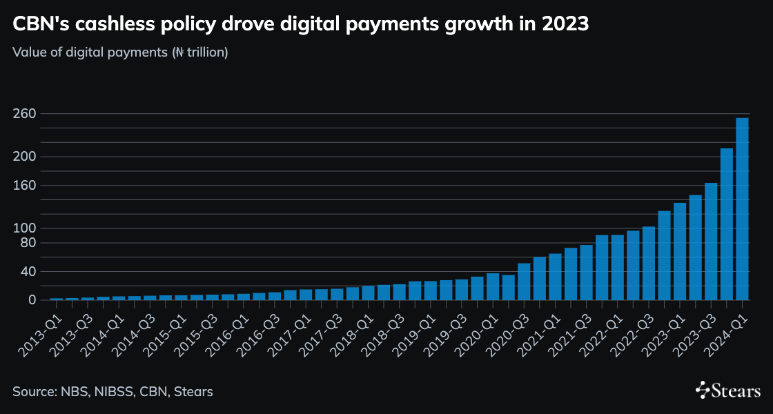 Nigeria's digital payment market has experienced exponential growth, increasing by 47.4 times to reach ₦657.8 trillion ($410 billion) from 2013 to 2023. This surge is primarily fueled by digital innovation and proactive initiatives from the Central Bank of Nigeria to enhance financial inclusion and reduce cash dependency.